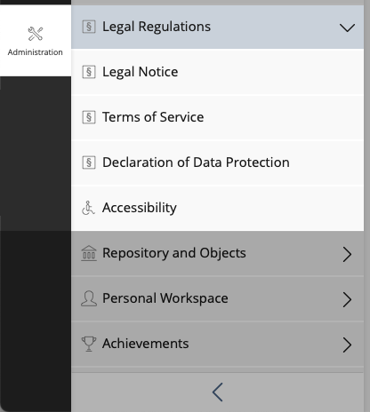 There are various legally relevant texts that need to be managed in an ILIAS installation. These include 'Legal Notice', 'Terms of Service', 'Accessibility Info' and the still to be implemented 'Declaration of Data Protection'.