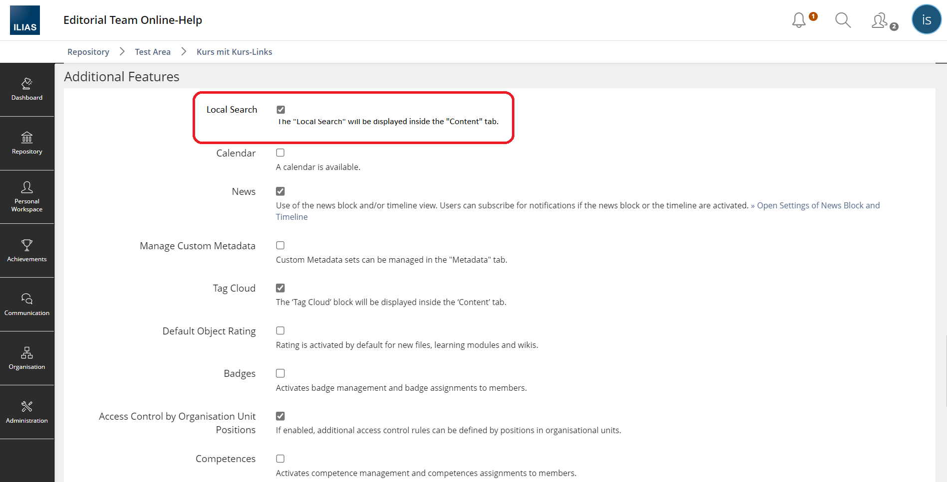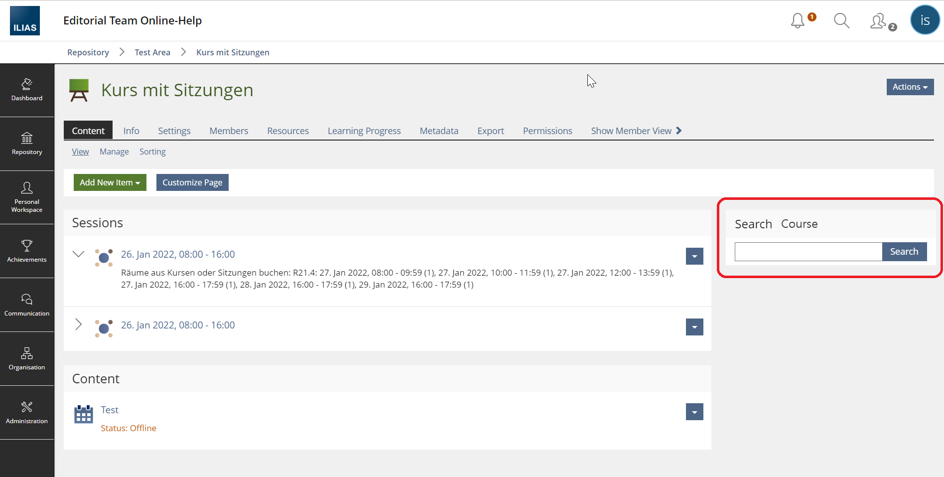 In course-objects a secondary panel "Search Course" will be integrated, which contains a searchbox. This searchbox will appear in the same manner as the searchbox in ILIAS wiki and forum objects. This searchbox can be (de)avtivated in the "setting" tab.