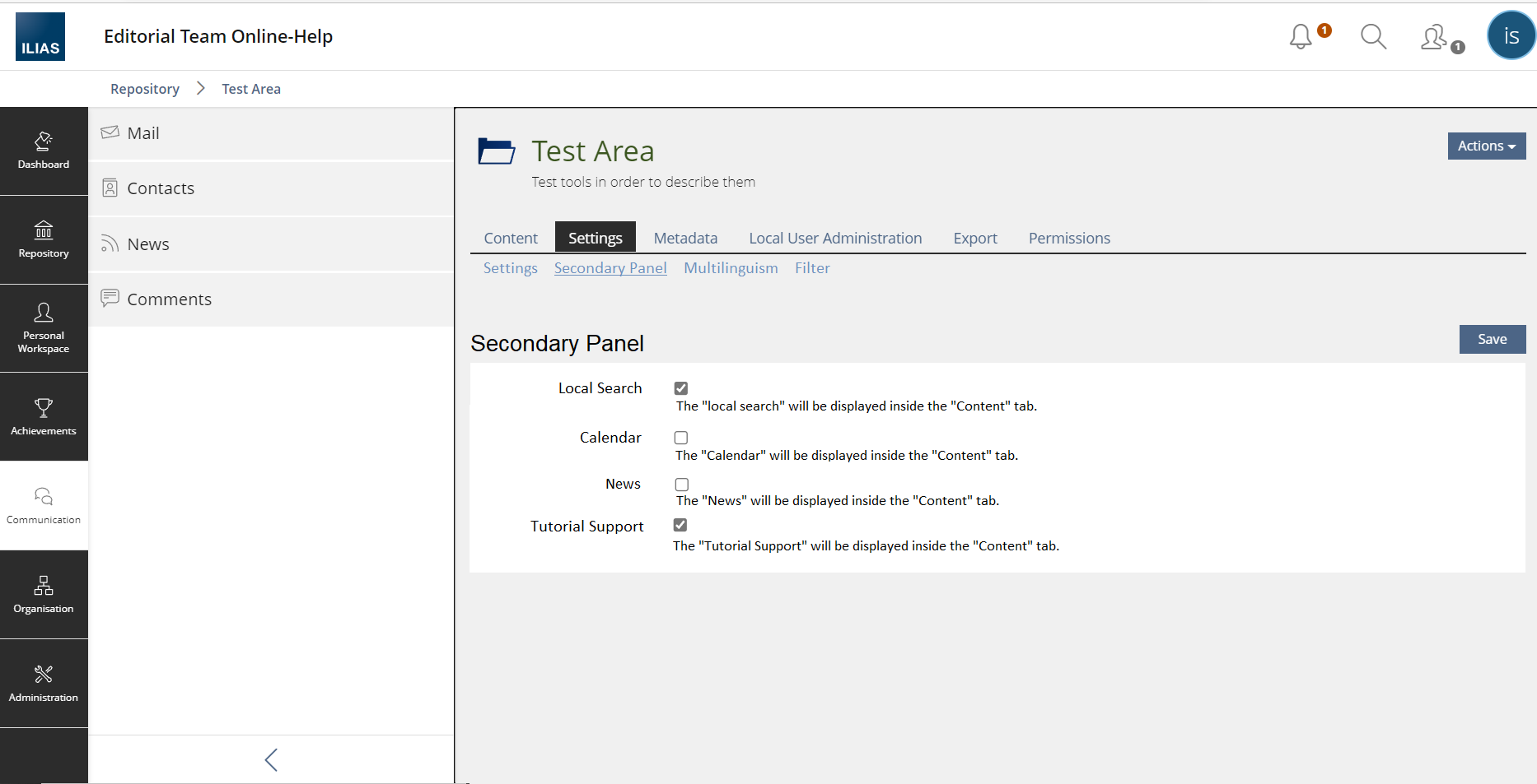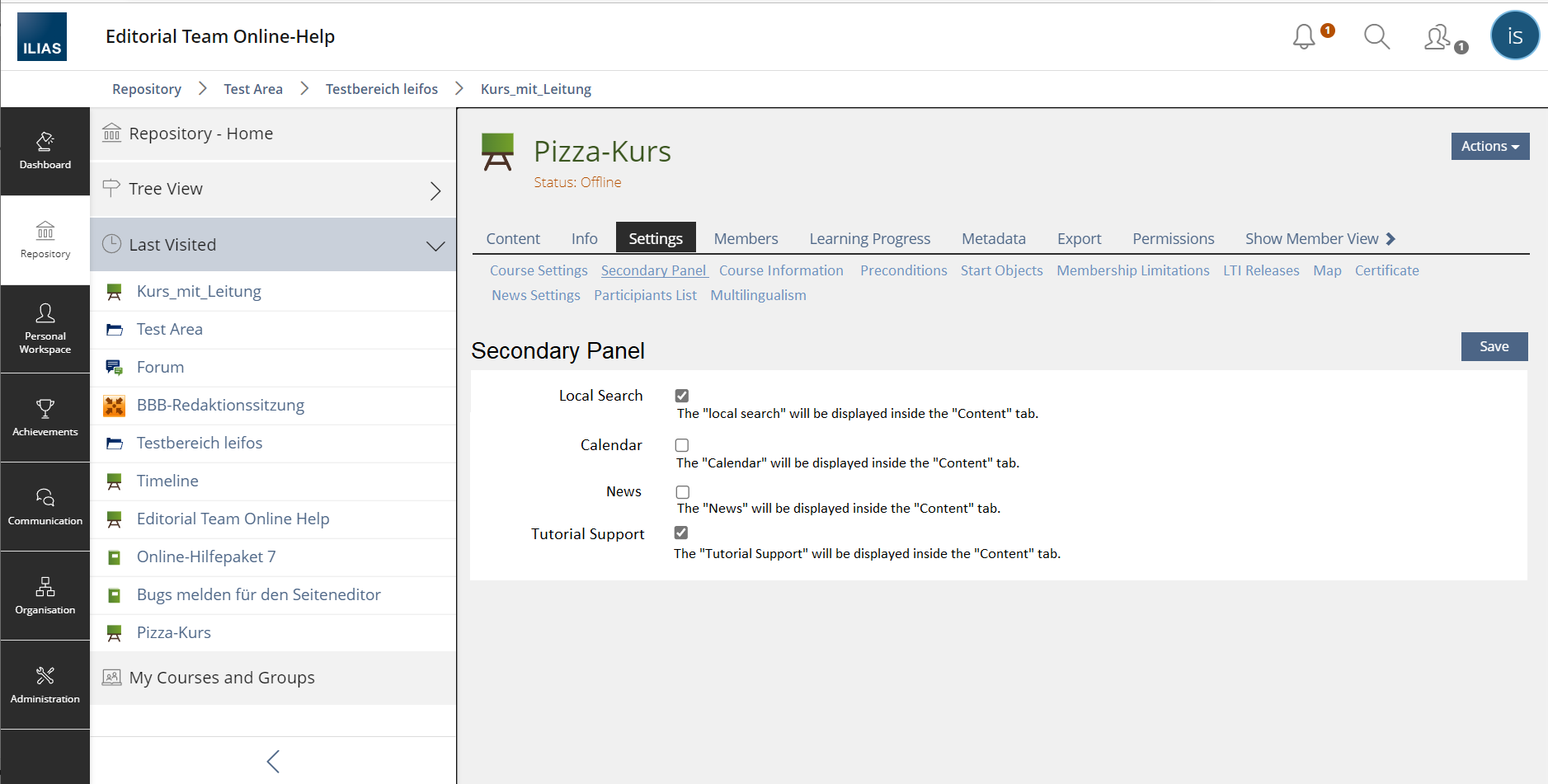 A newly introduced sub-tab "secondary panel" of the setting tab in course- and category-objects will inheritage all "display-options" of the secondary panel (see screenshot). Therefor the additional features "news" and "calender" will migrate to the new sub-tab "secondary panel". Addition to that the potencial new features "local search" and "tutorial support" will expand that list.