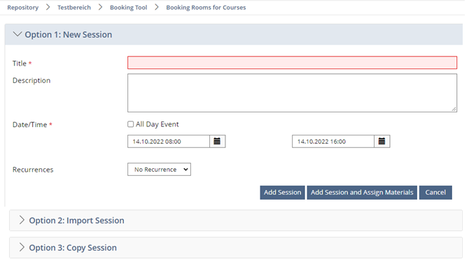 - The accordion "Option1: New Session" comprises a not more than the average Title, Description, Type.