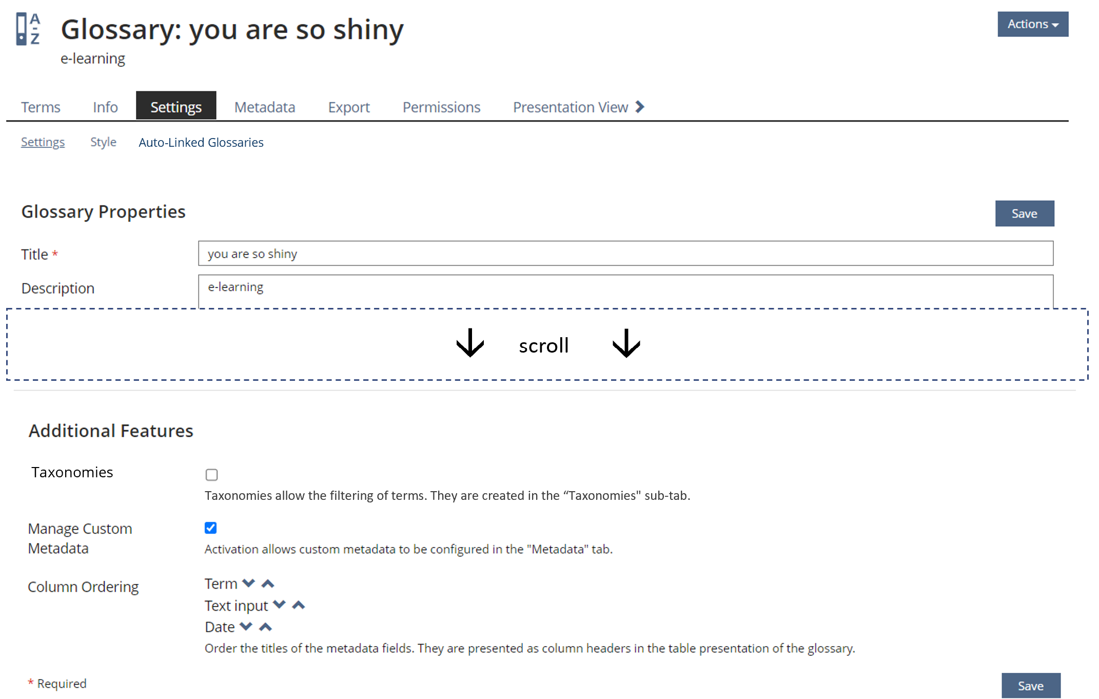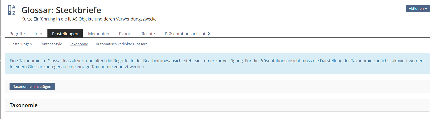 - In the Editing View of Glossaries, using the service Taxonomy does not require activation. However a setting concerning the presentation in the Presentation View is offered.