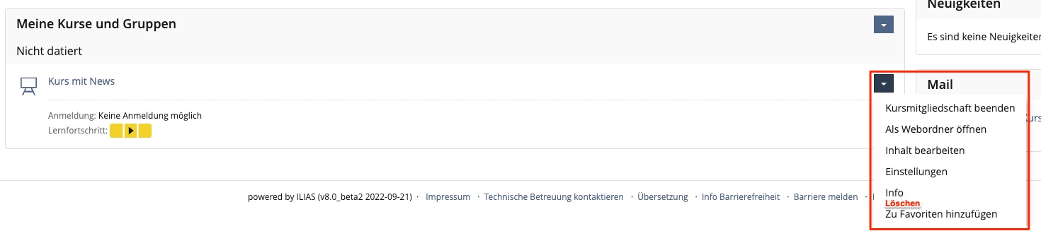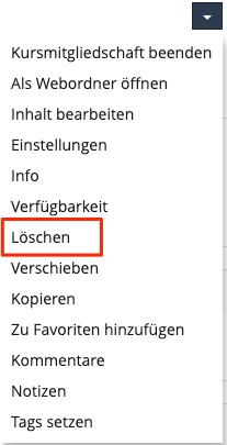 Administrators (global), course administrators (local) and owners of a course have the permission to delete courses. To do so, they must be in the right container object and can then delete the course via the Actions menu.