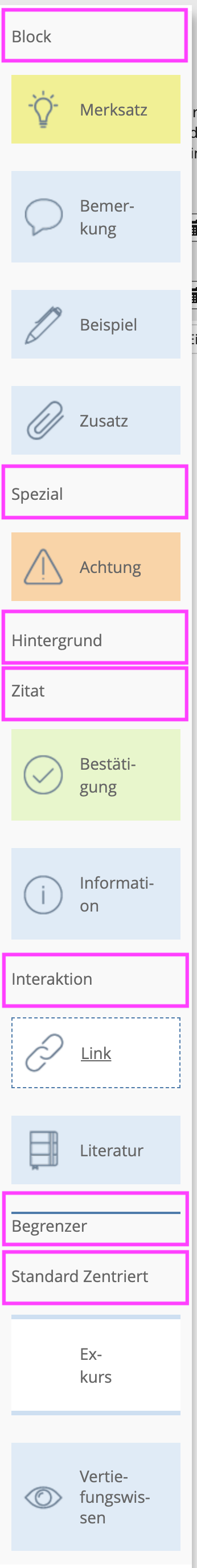 So far, the semantic sections always have a background color and an icon centered vertically on the left edge. This leads to several problems. The contrast is relatively low and with "long" sections the icon slides very far down, so that the semantic meaning is no longer recognizable.