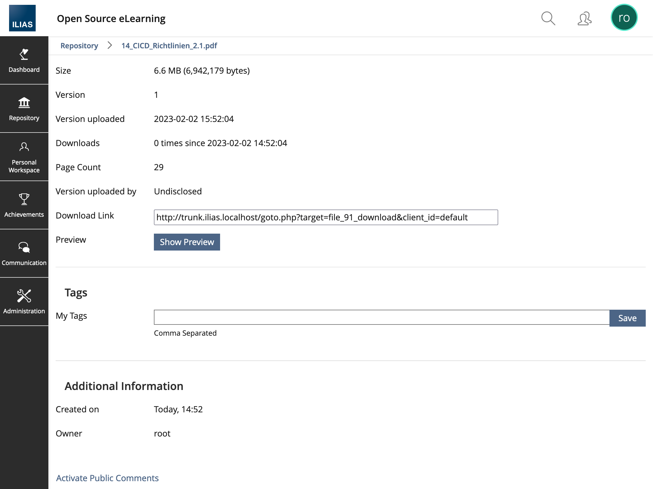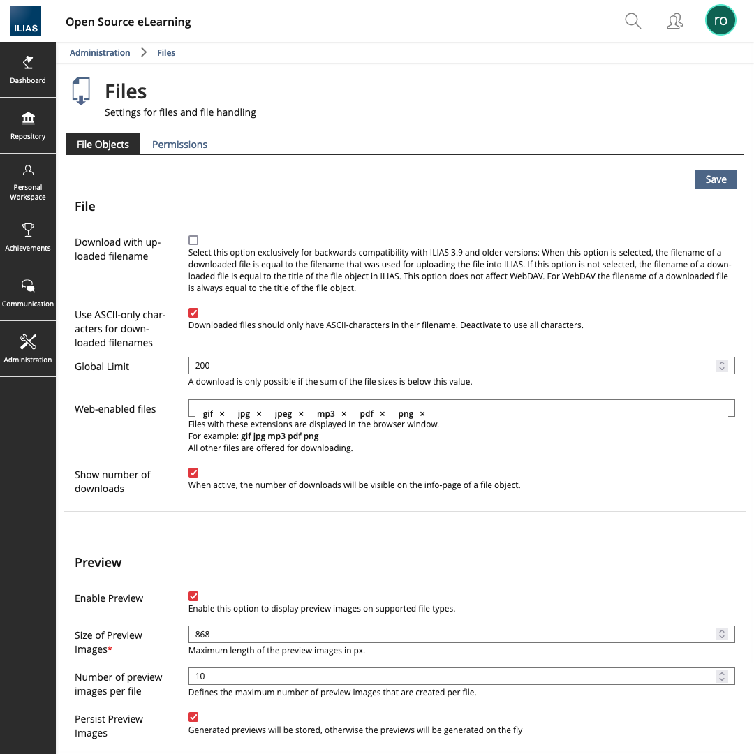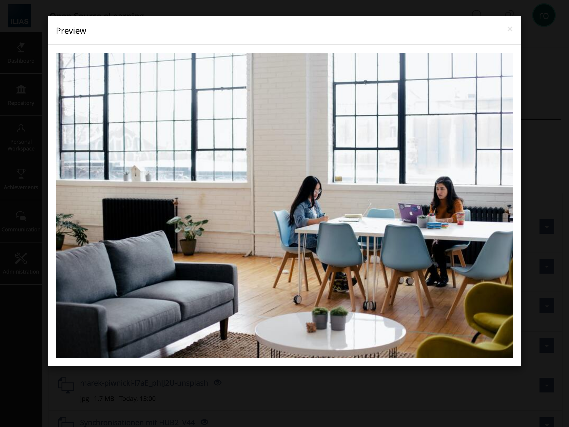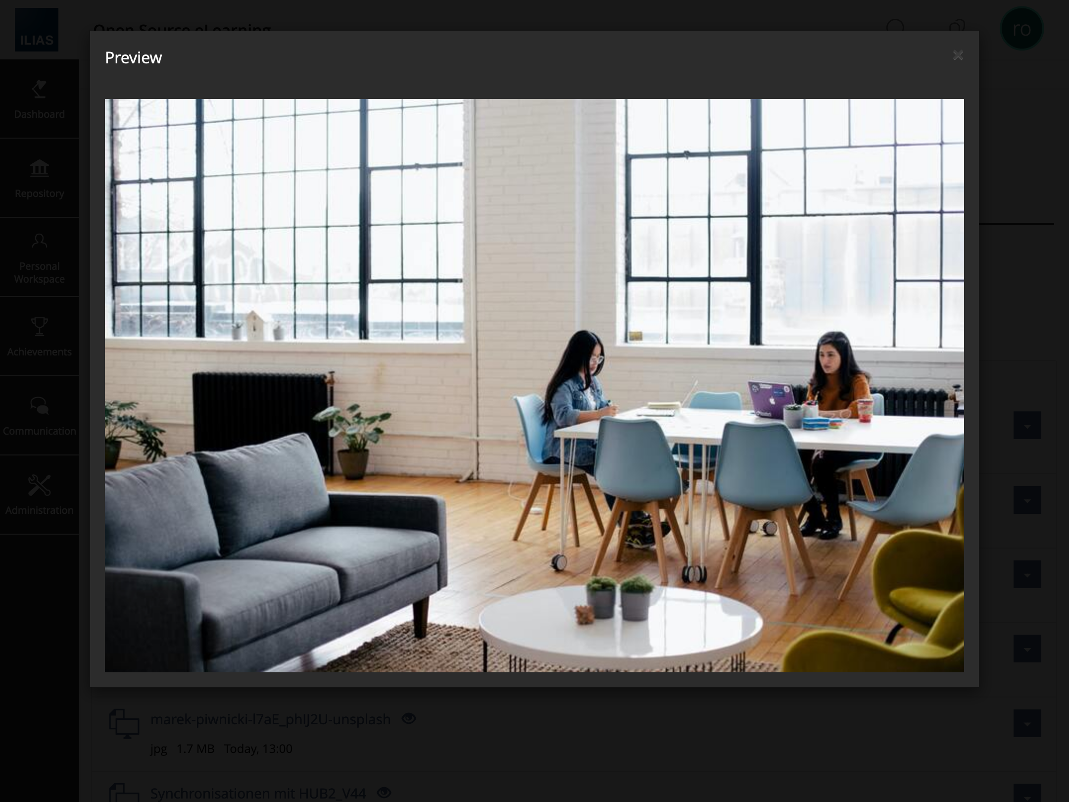 The file object knows since ILIAS 4.4 the possibility to display preview images for supported file types directly in the magazine and on the info page. With ILIAS 9, the mechanism of how thumbnails are created is changed to IRSS Flavours in the background. Optically, however, this does not change anything.