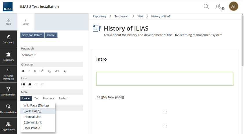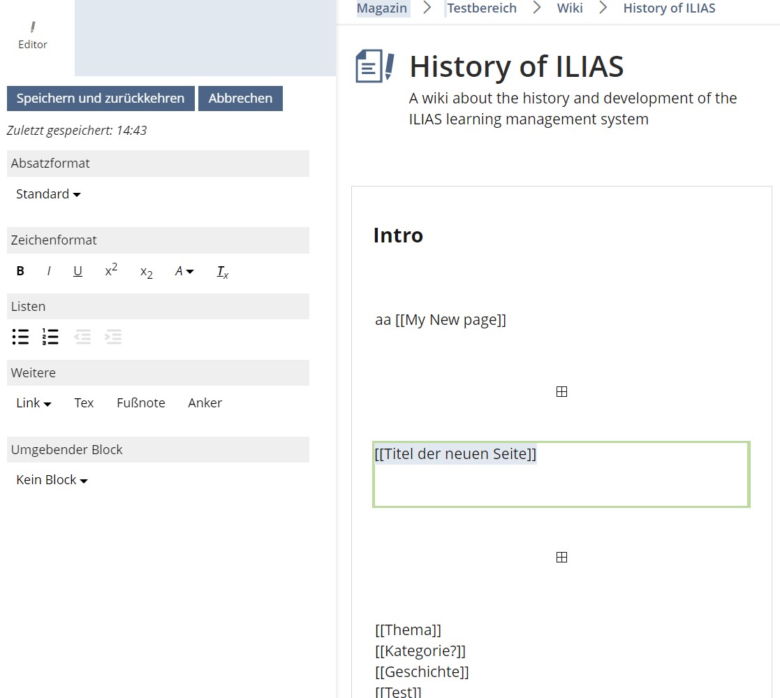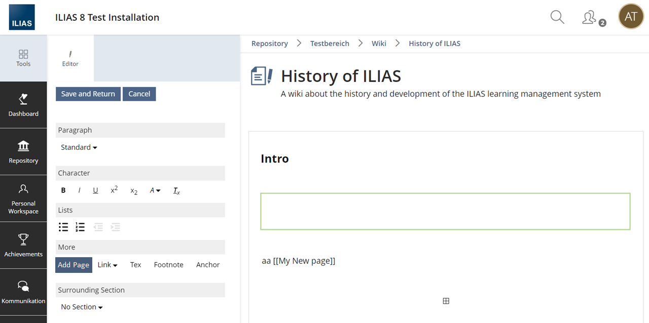 When curating objects for study groups for DigikoS the wiki was left out, because students "cannot work with it." This also was the diagnosis of some Swiss universities quite some time ago: Add function new wiki page.