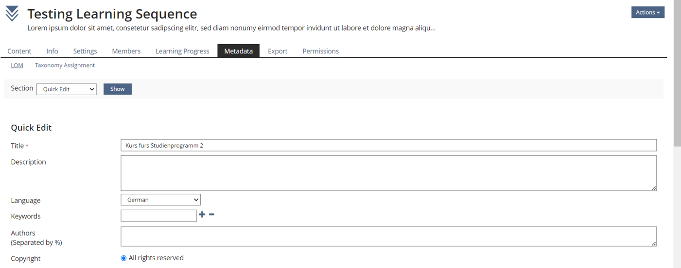Metadata (and thus taxonomies) cannot yet be used in learning sequences. For this reason, learning sequences cannot be provided with information on the language and licence, which would be particularly relevant in cases where these learning sequences are to be exported and published as OER, for example.