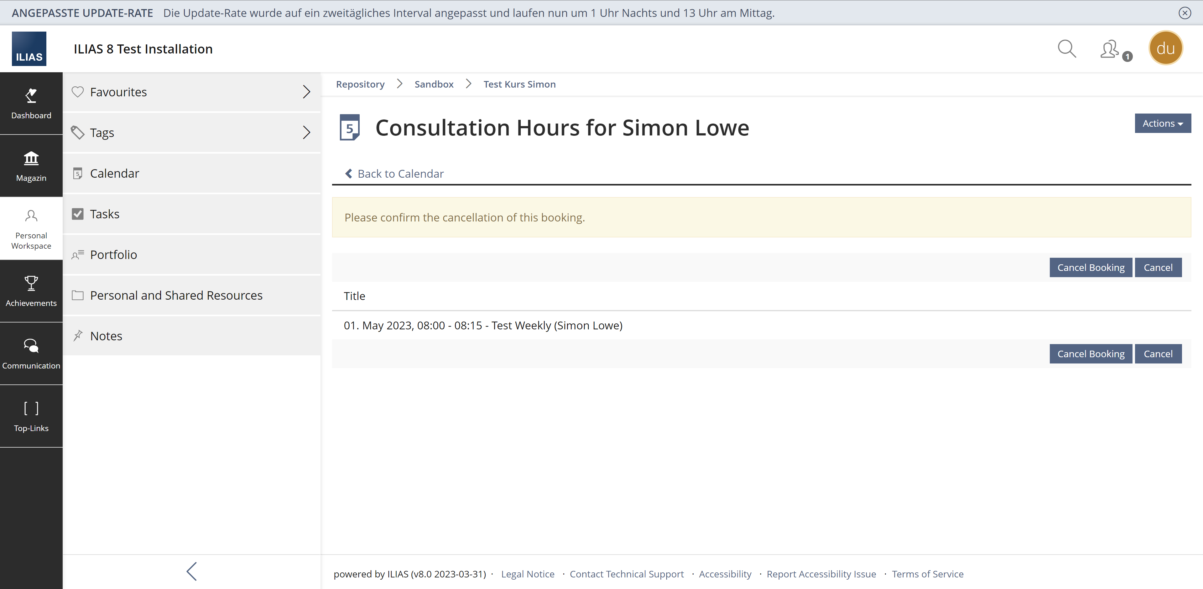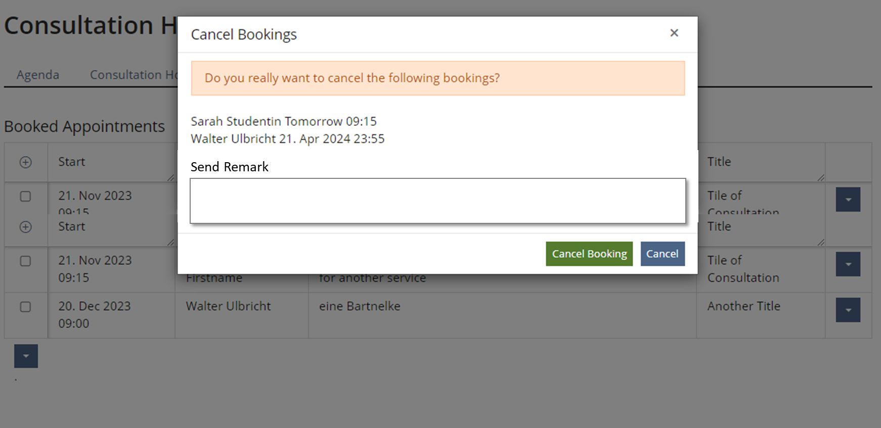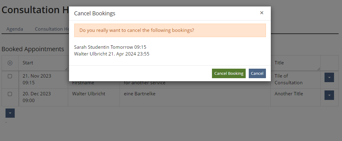 - Cancellation Confirmation after "Cancel Consultation Hour" Action in table "Calendar" > "Consultation Hours " > "Booking" > Table "Booked Appointments"