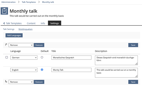 - Administration > Organisation > Talk Templates > Title of Template > Settings > Multilingualsm (new sub-tab)