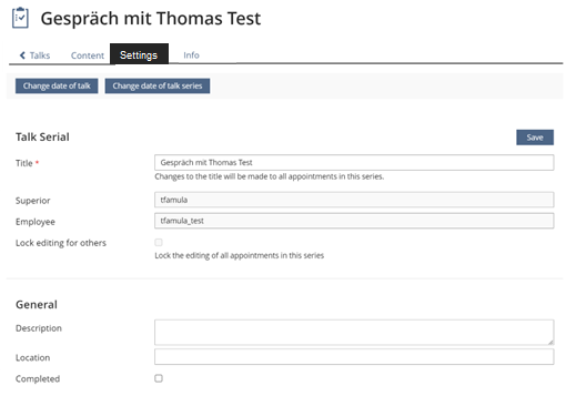 The Content-Tab of the Talk comprises its Settings, as well as the assigned Custom Metadata used for minuting. This is confusing.