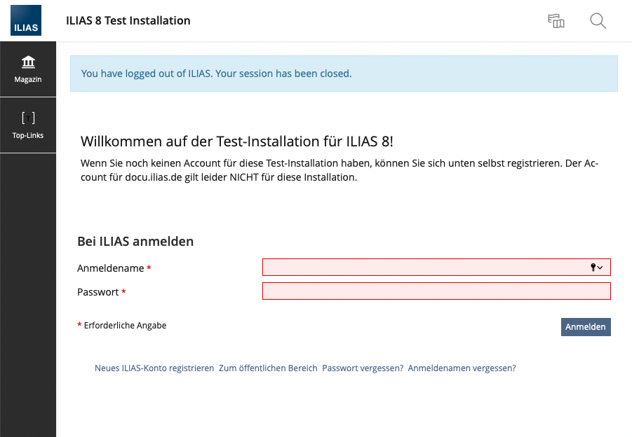 An info message is displayed which explains "You have logged out of ILIAS. Your session has been closed.".