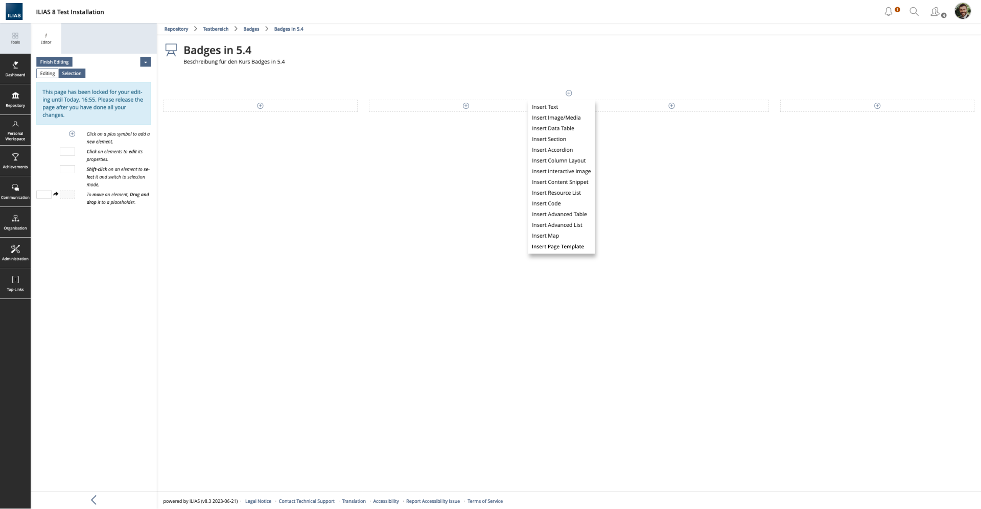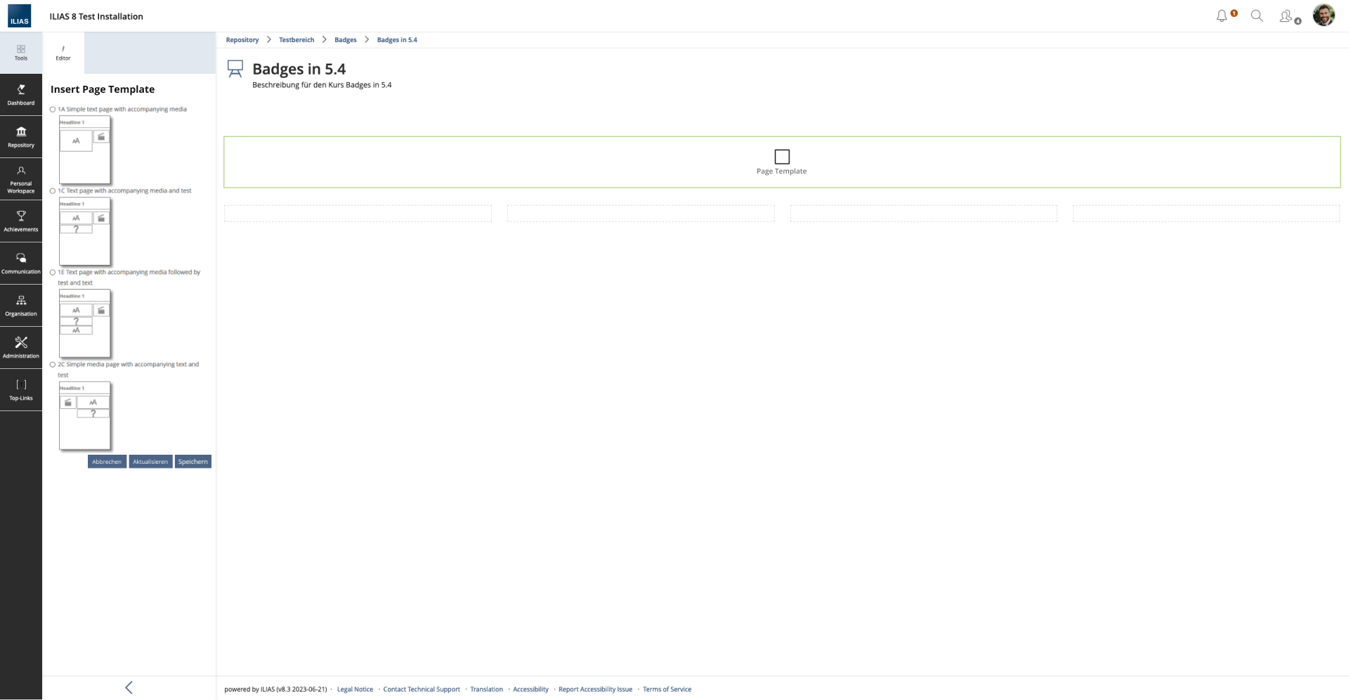 With ILIAS 9 Page Templates become a page editor element. The page templates can be selected and inserted in the Page Editor via the Create Menu. In this way, page templates can be made available even in objects that do not have pages, such as container objects.