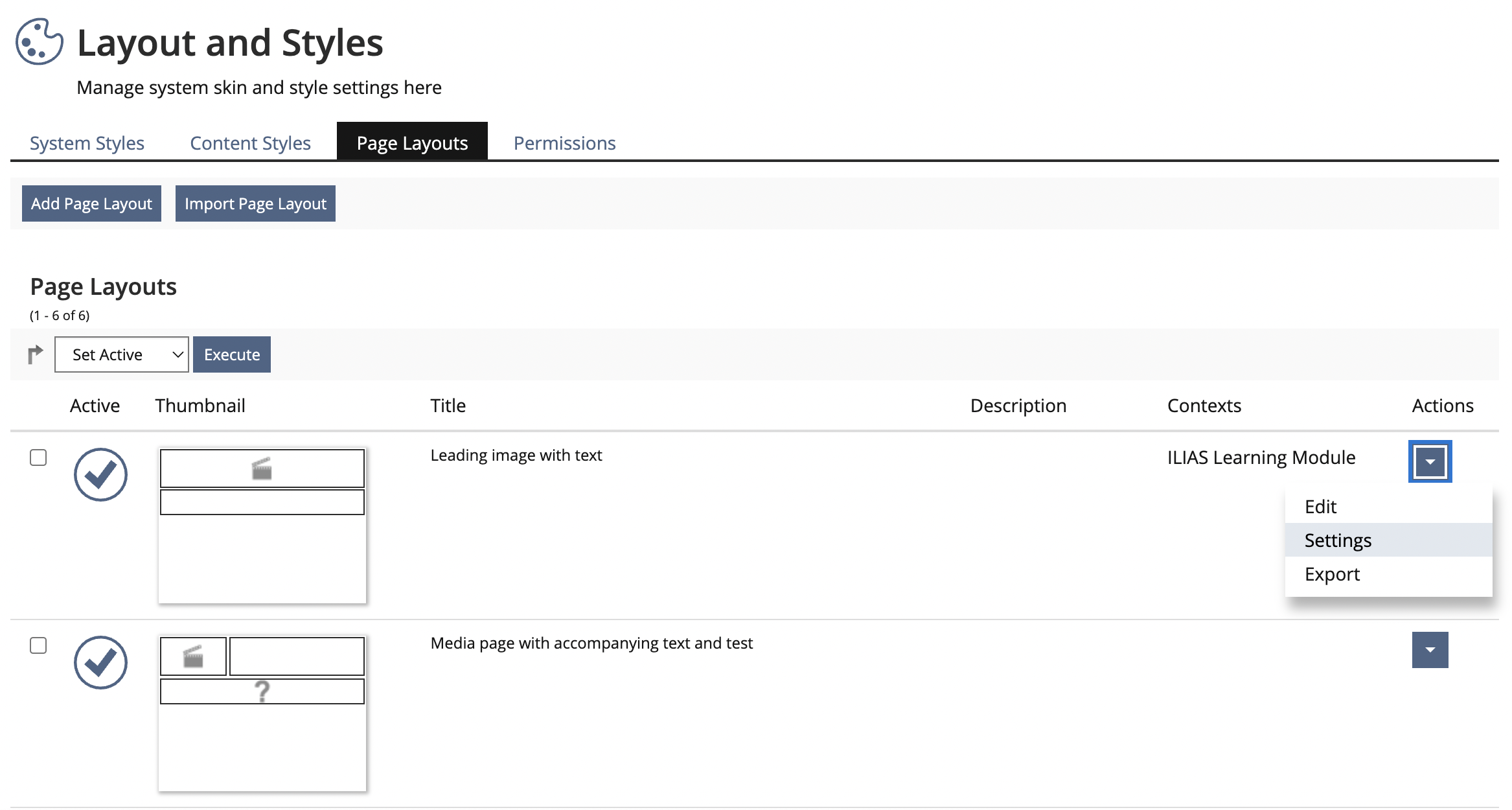 Contexts in which page templates can be inserted are listed in the administration. Page templates can be activated or deactivated for individual contexts.