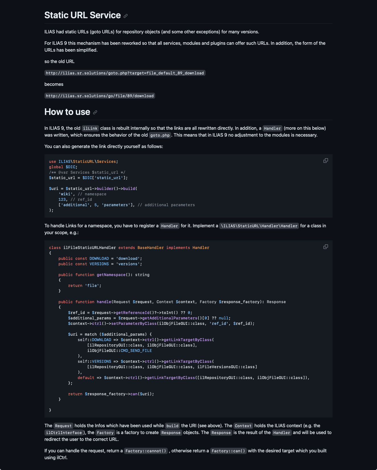 ilLink::_getStaticLink. But on the one hand the implementation is very inflexible (see for example the implementation in goto.php). Thegoto.phptriages the goto URLs via a large switch statement, which is not scaled and not generic. The goto links also come from a class that is currently only implicitly maintained, but actually provides a very important function in ILIAS: deep linking. - For some other places there are also links that are practically static, namely those that only contain a baseClass from ilCtrl (e.g.