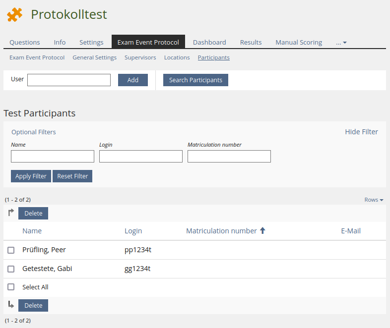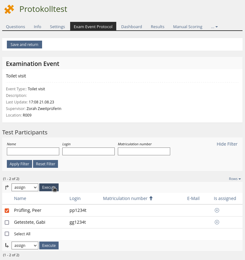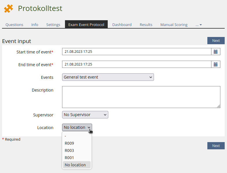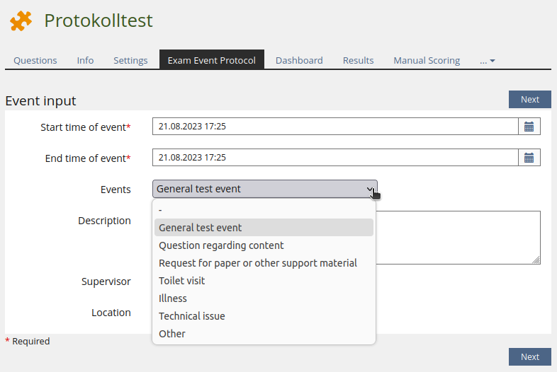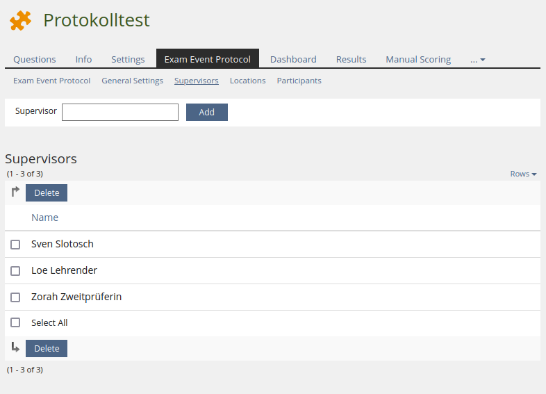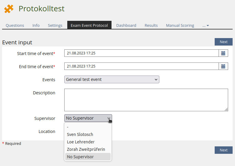 A new tab must be developed for the test, via which the protocol is managed and displayed. In the run-up to the examination, the initial settings for the digital examination protocol are made via this tab. These include basic settings such as title, type of exam, type of supervision, allowed references and whether the exam takes place online or on-site. Furthermore, it should be possible to specify the names of the supervisors and the examination rooms. Since the supervisors do not always have to be members of the university, they are entered manually. The same applies to the examination rooms, as in this case there is no interface to the university's room allocation system. The examination participants should be able to be inserted via the search.