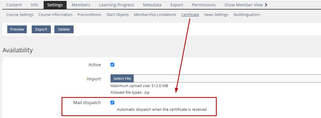 - Activation of the certificate dispatch in course object