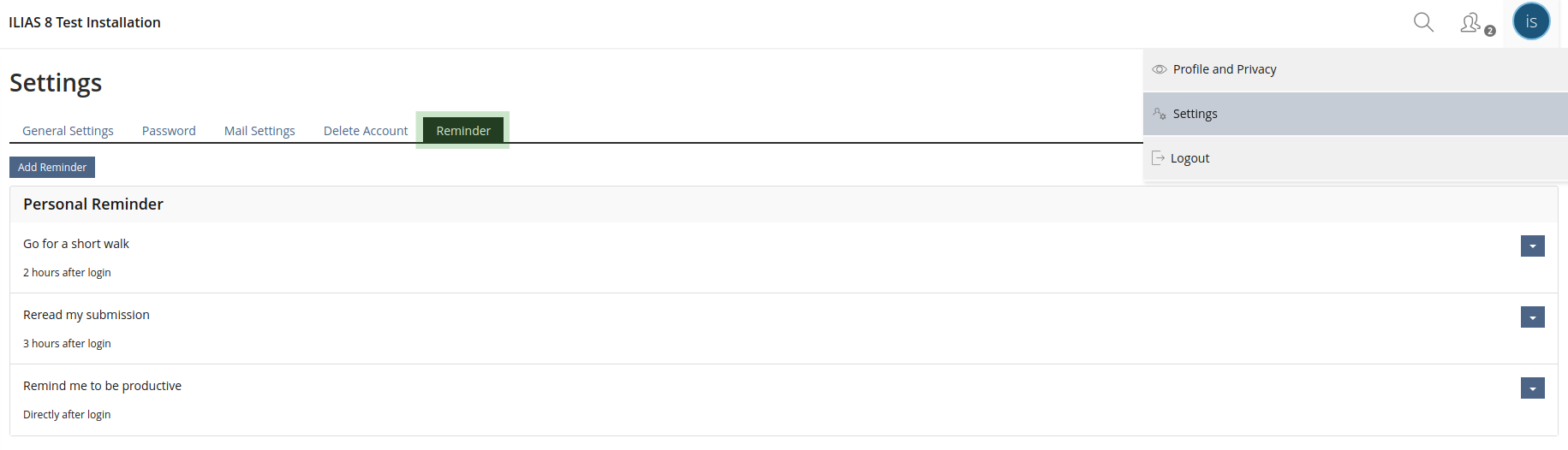 The reminders are independend to other ILIAS content and events and only ment for the users personal purpose e.g. break times or appointments. - Milestones