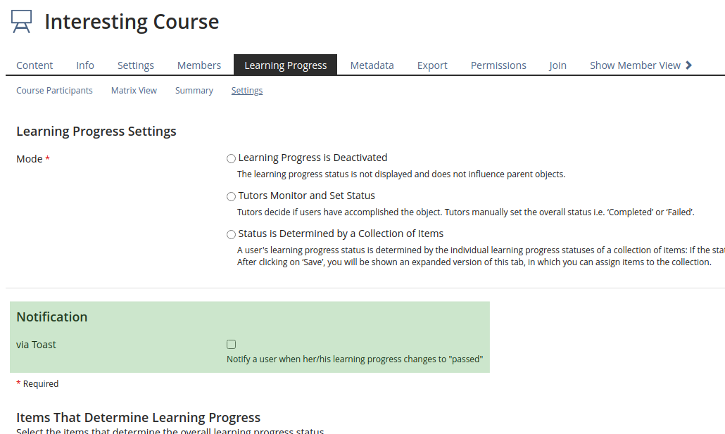 If activated, the user should be notified after receiving a certificate from said object or after its learning progress changes to "passed". - Deadlines