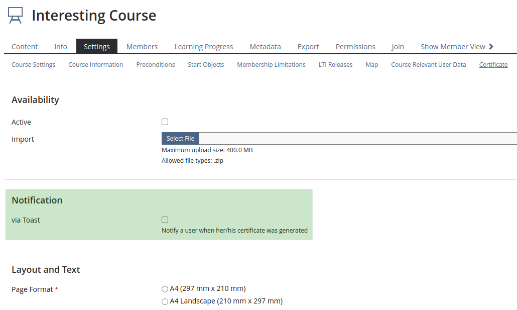 The moderating authority (e.g. the tutor) of an object should have the option to inform members about the receipt of a certificate and the change of a learning progress to "passed". For this purpose she/he has the option to activate a notification via toast inside the certificate settings and the learning progress settings. Both event should be independend from the objects type an context and a centralised within the general services of certificates and learning progress (aka. tracking).