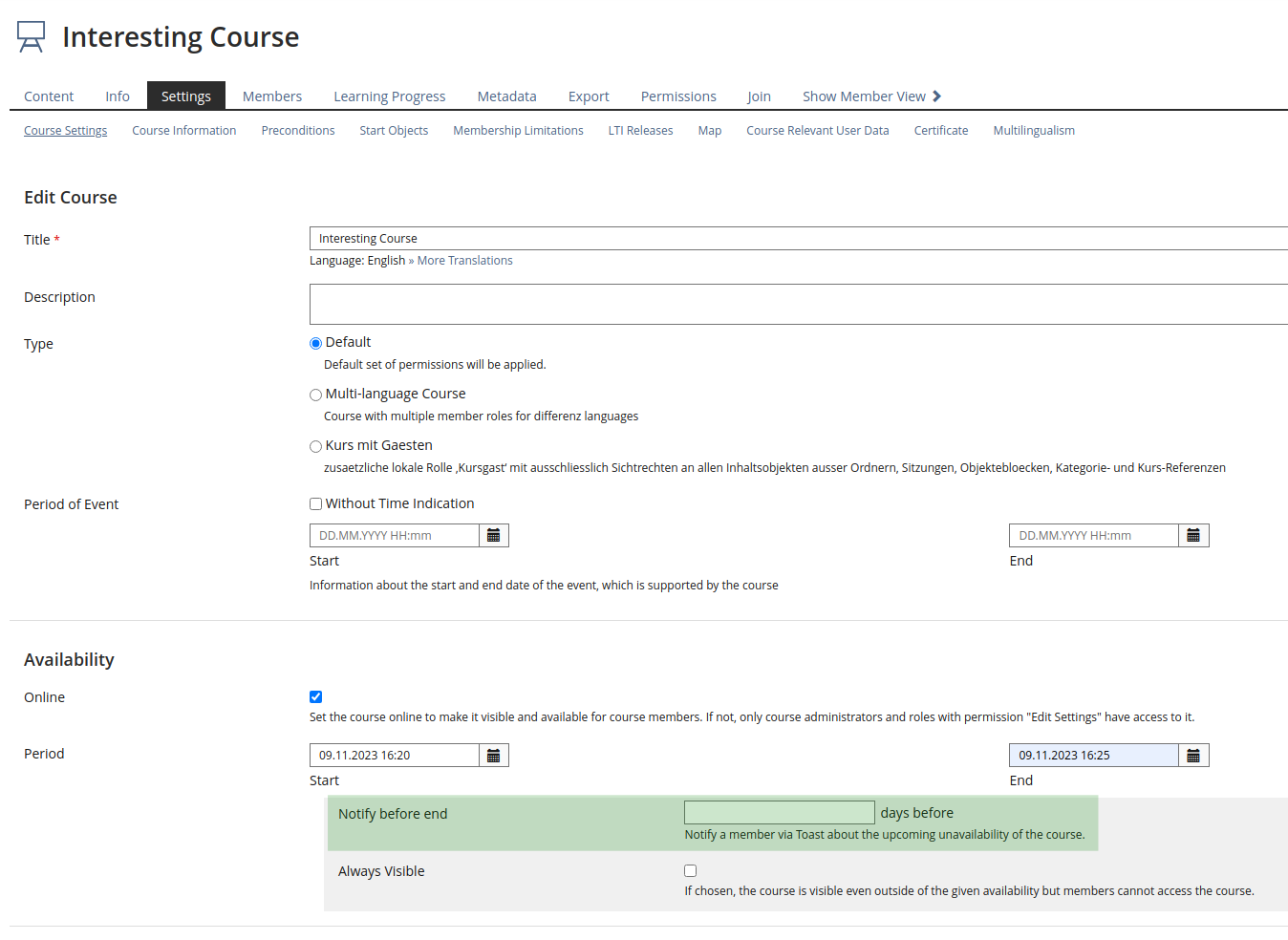 The moderating authority (e.g. the tutor) of a course should have the option to inform members about the upcoming unavailability of said course, when she/he limits said availability inside the course settings. This option should contain a setting wich appears when a limited availability is set and should provide the possibility to define a relative time in dates before the end of the availability in which the users are informed about that. If set, the user may receive a notification regarding the ending availability of the course. - Background task termination
