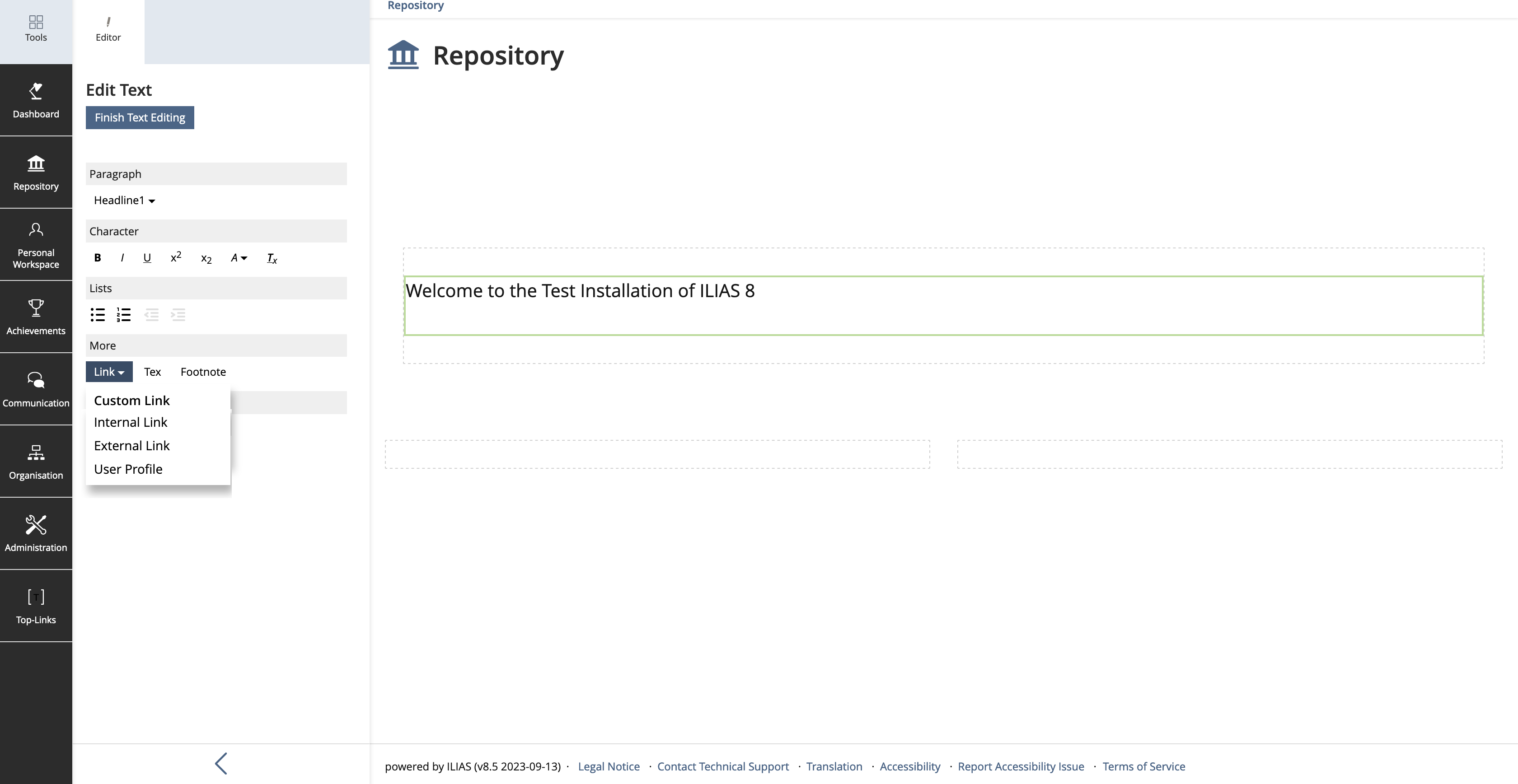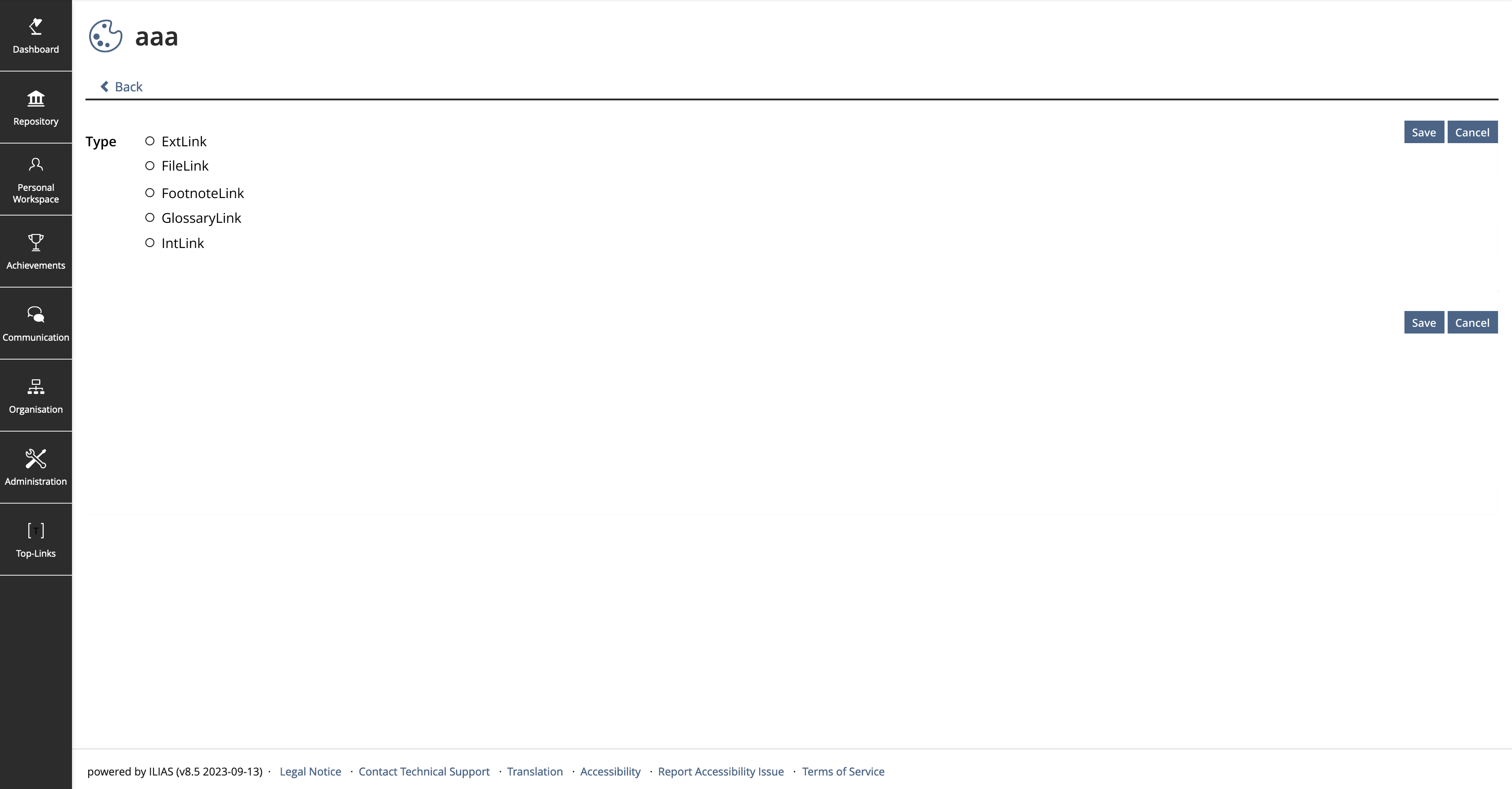 Content styles are often extended with elements that represent a button. Mostly sections are used for this purpose. Users create a section "Button" and link to e.g. an ILIAS object.