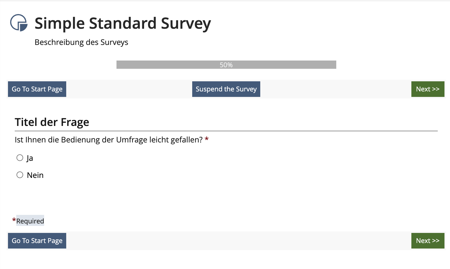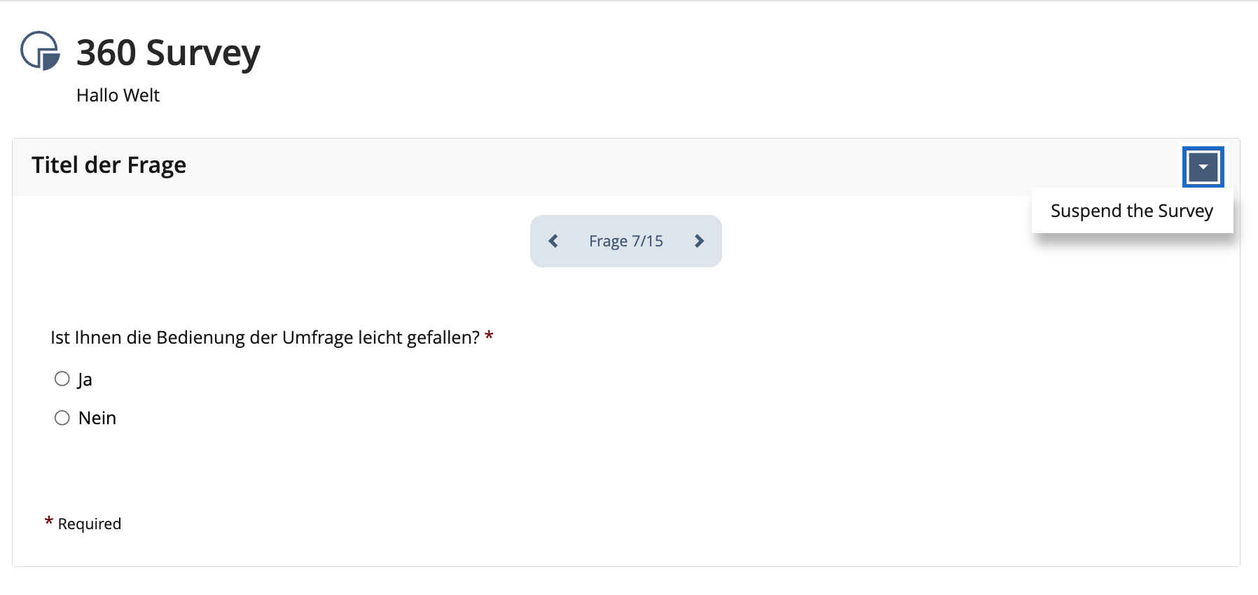 Seiler, Yvonne [yvseiler] 10. JUNE 2024: I find it somewhat unfortunate that actions are available for the survey within the question item (Suspend Survey, ViewControl). The question title appears so far away from the actual question. Have you thought about using a ListingPanel in which the ViewControl and the dropdown could be arranged on the same line (like Example 2 Standard Listing Panel)?