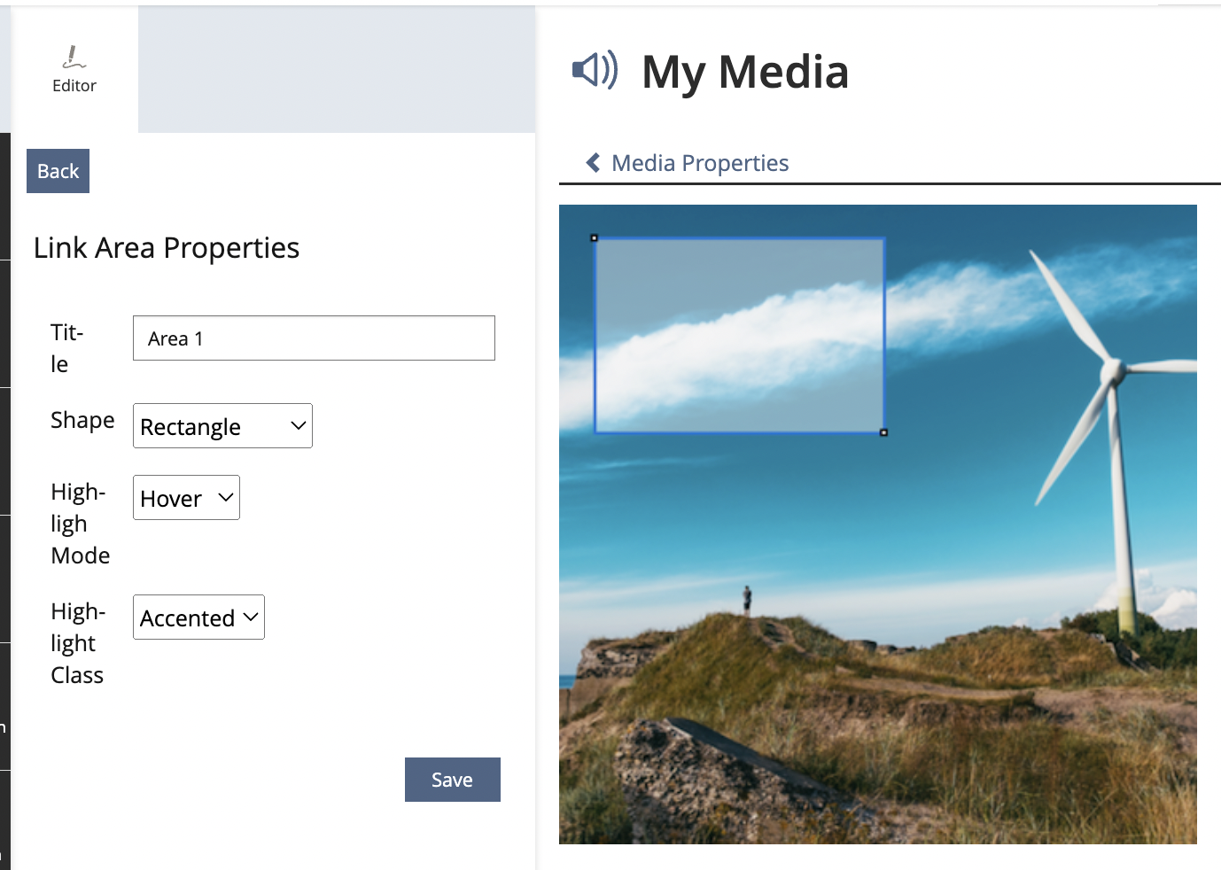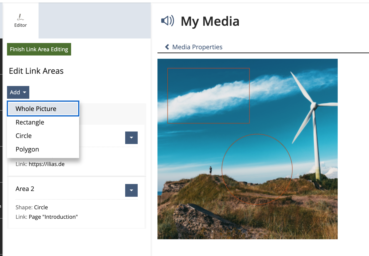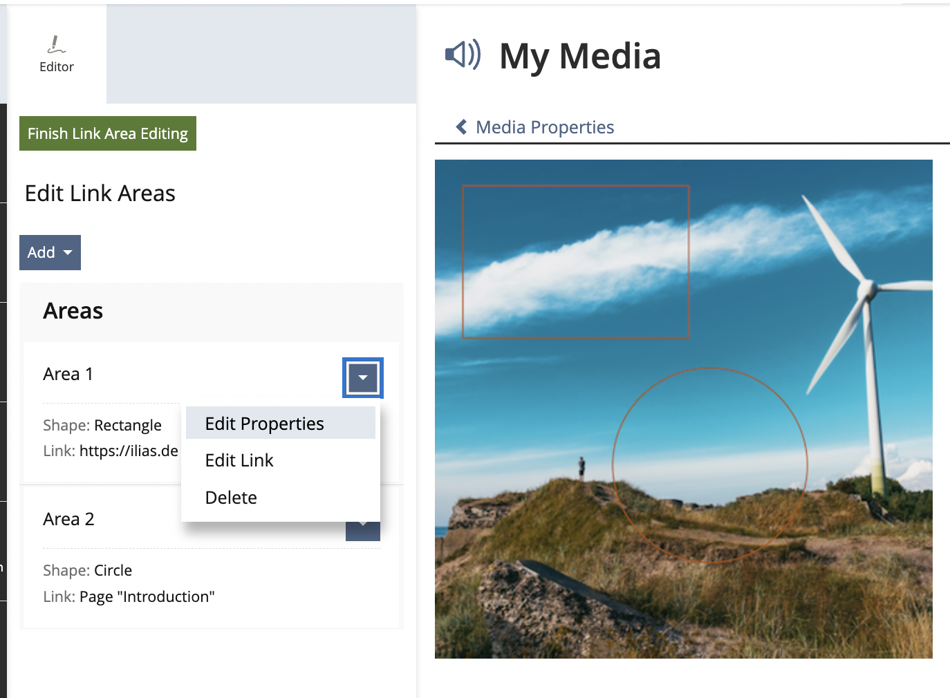- a button "Finish Link Area Editing" the returns to the media object properties