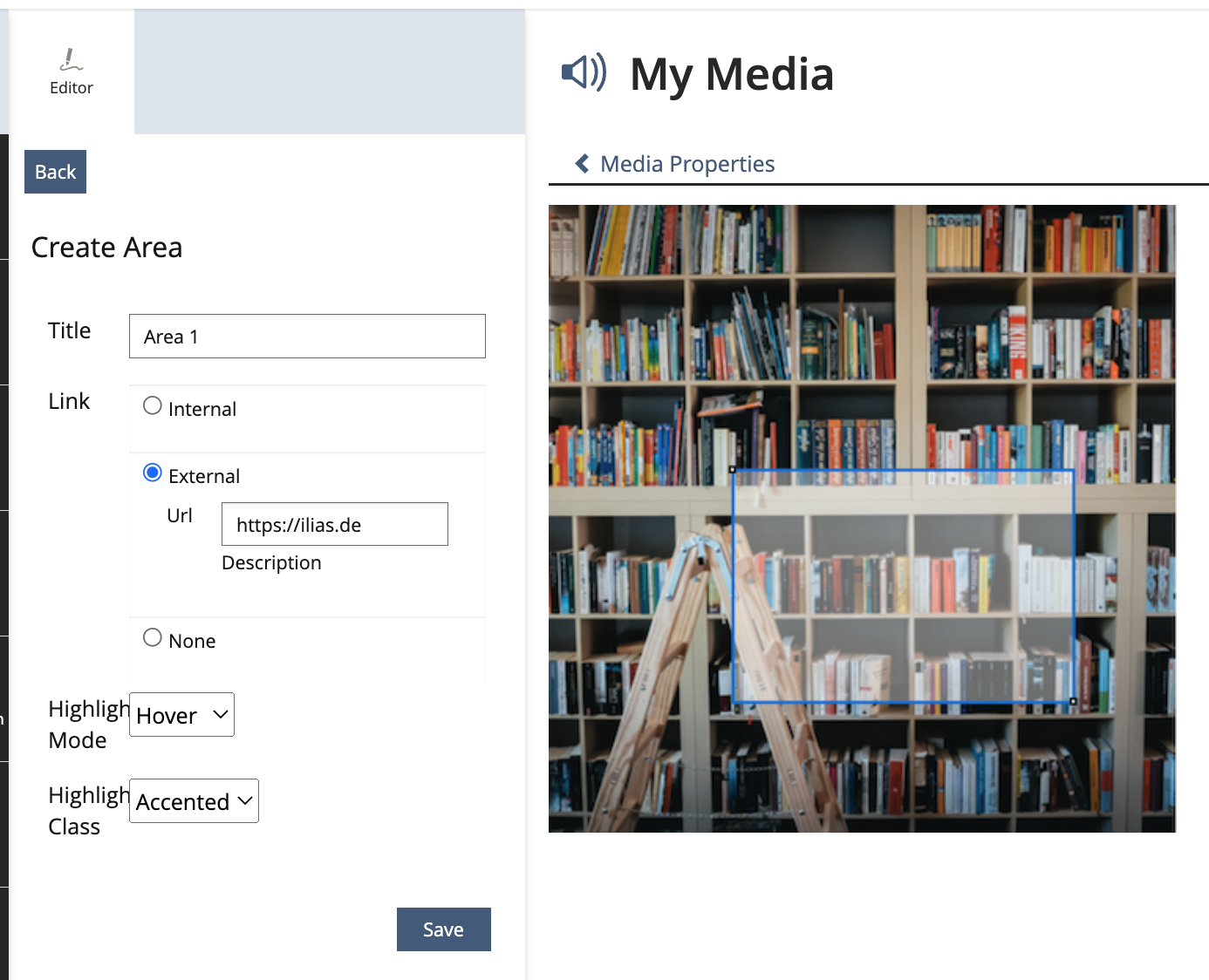 After clicking "Save" ILIAS will save the new area and return to the overview only, if the link type is "External" or "None".