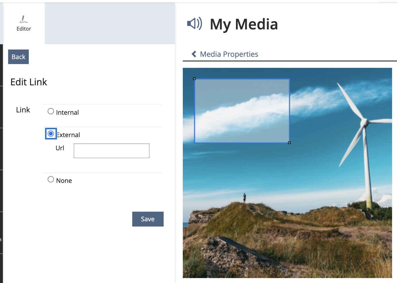 - a URL input field for the target of external links