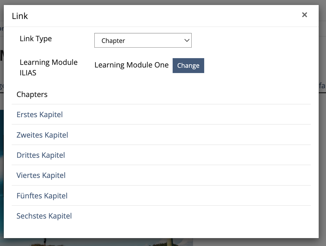 After clicking "Save" ILIAS will save the properties and return to the main view, except if the link type is "Internal" a modal will be presented for the internal link selection. The link selection modal will be the same as in ILIAS 9.