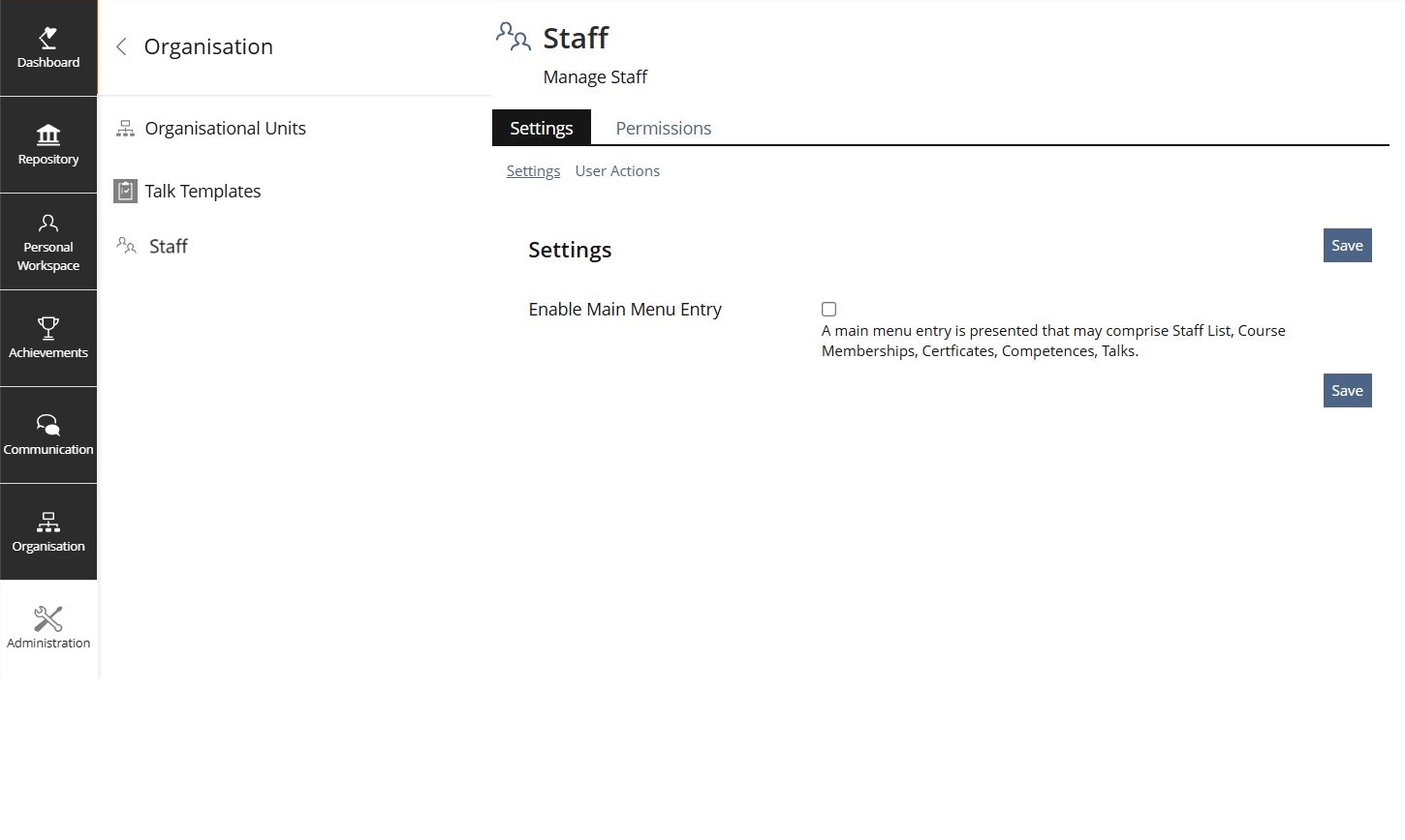 Staff should have its own administration node, in which its views can be enabled and its user actions configured independently.