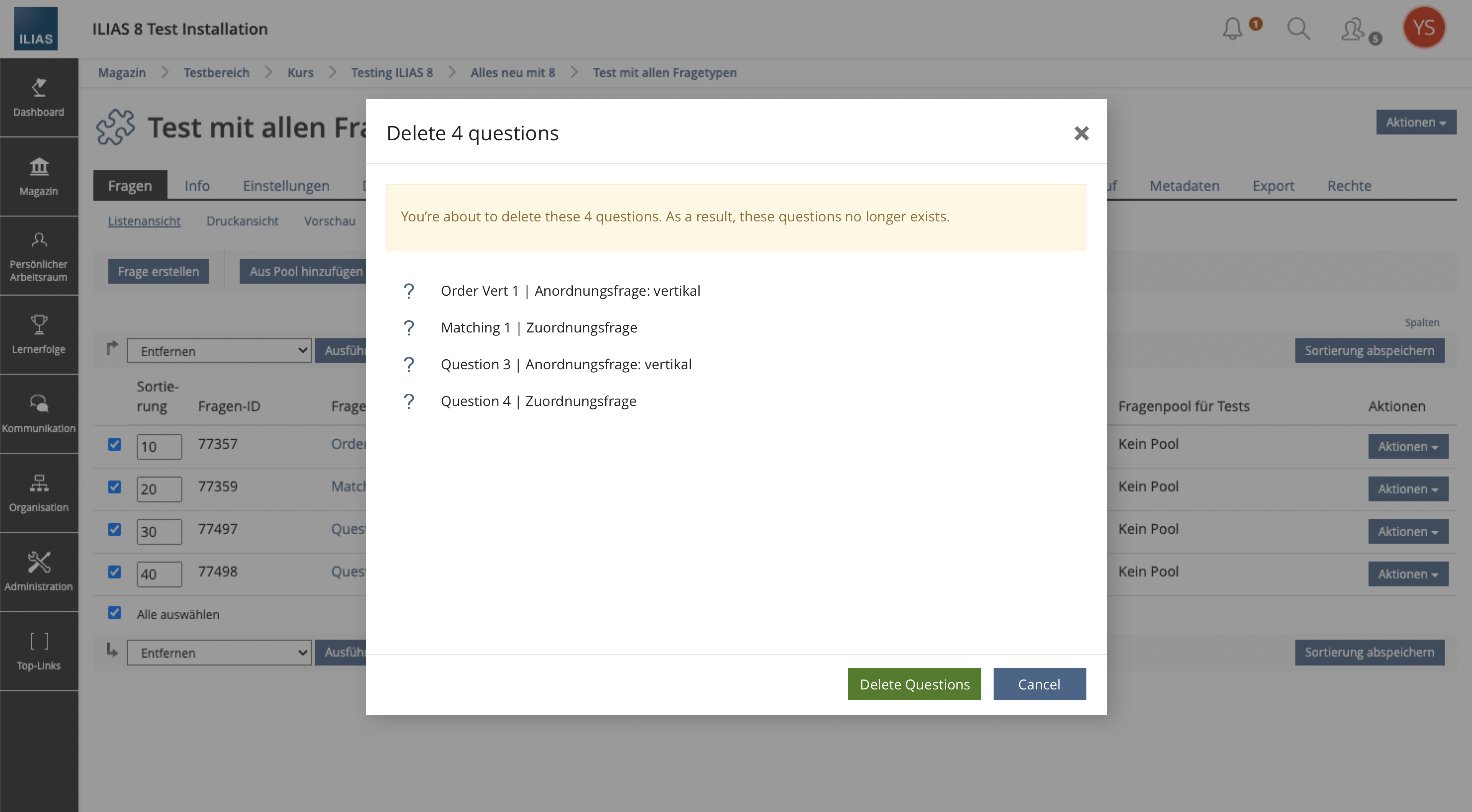 - Buttons (D): With a primary button "Delete [type of items]" (z.B. Delete Questions) the action can be executed and confirmed, with a default button "Cancel" the action is canceled and you return to the content page with the selected items.