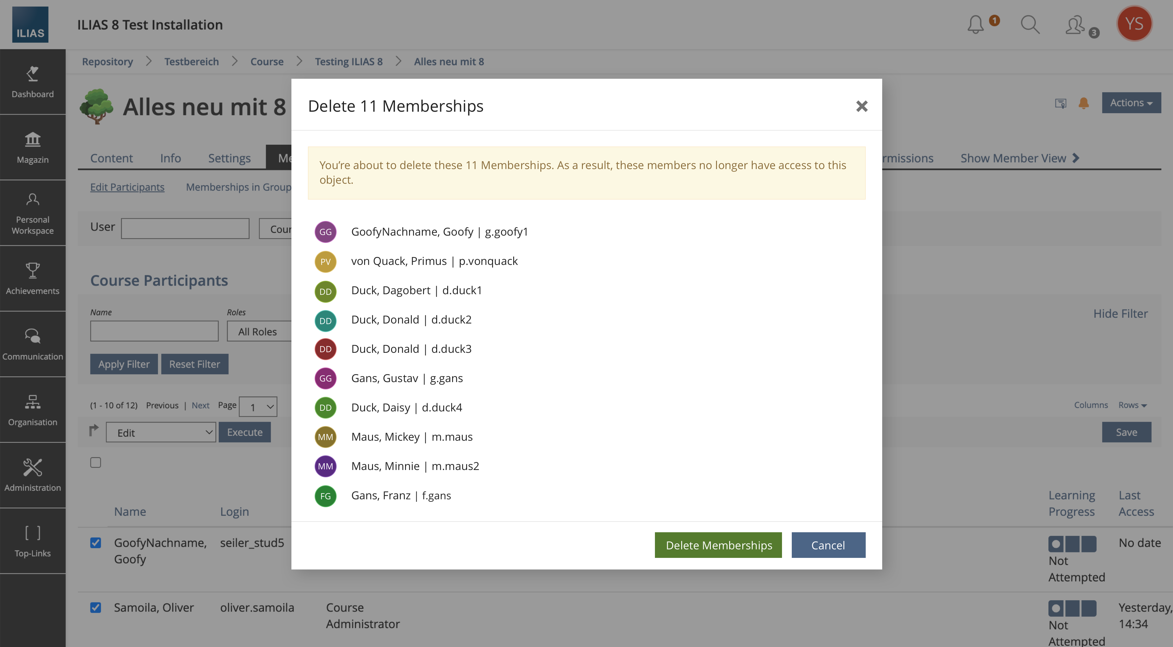 The confirmation request after triggering a delete action (e.g. objects from course, questions from test, accounts from the system, memberships from course) should be done via an interruptive modal.