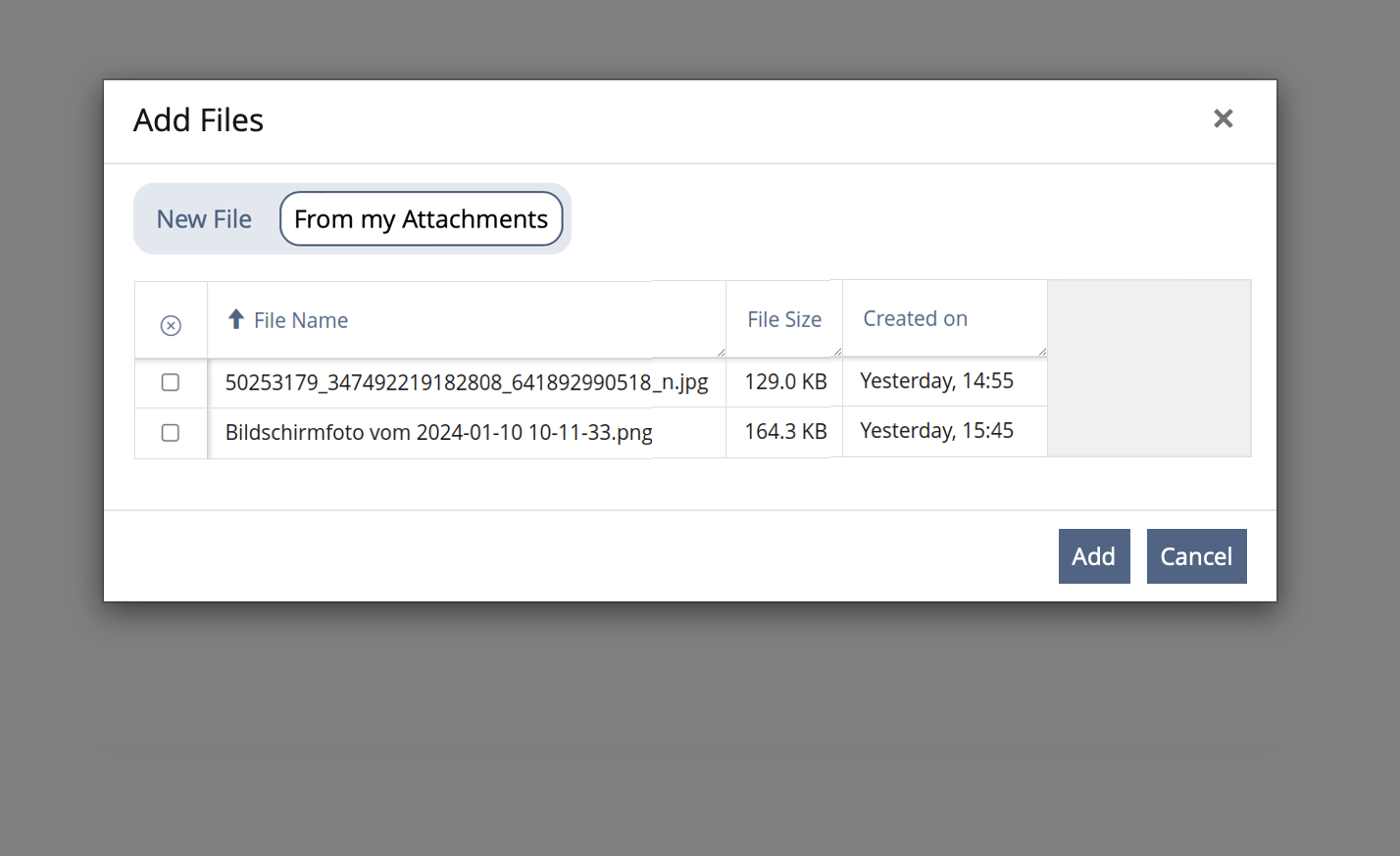 - Selection of n files from the set of all file attachments that the user has stored. Each attachment that is to be added is selected via a checkbox. (Using a derivate of a UI Data Table)