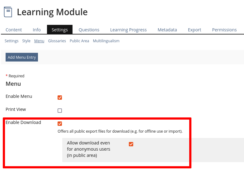 Form the 'Settings' tab of ILIAS Learning Modules and Glossaries (for the former in the subtab 'Menu'), the option 'Enable Download' will be removed. Further, the 'Download' menu entry in the Presentation View of ILIAS Learning Modules and the subsequent modal, and the 'Download' tab in the Presentation View of Glossaries will be removed.