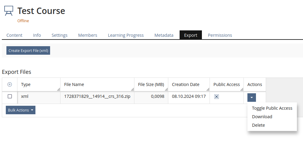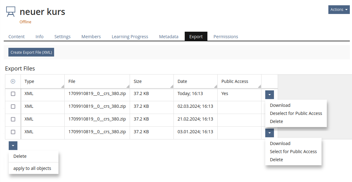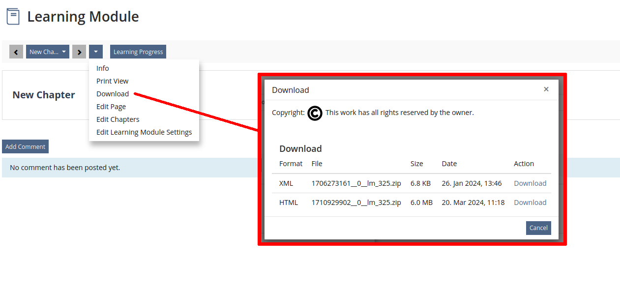 Kunkel, Matthias [mkunkel], 10 APR 2024: Am I right that with this change either an XML or an HTML export file of an ILIAS LM can be offered for download? So I have to decide if I want to offer an HTML export version of my LM to the public or the XML one that can be edited afterwards, right?