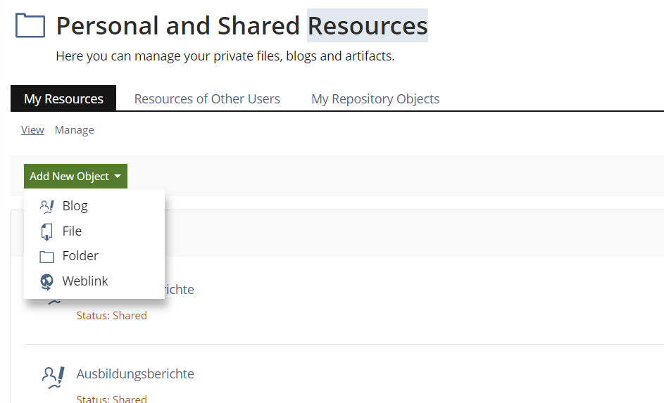 - My Resources: Files, Weblinks, Blogs, Folders.
