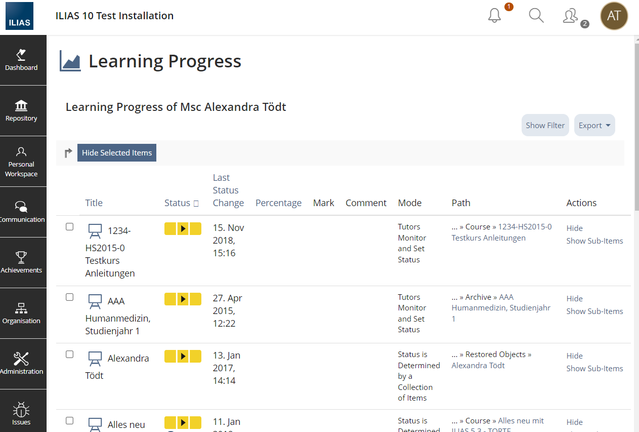 The Main Bar entry Achievements > Learning Progress shows two tabs to those who have access to the Learning Progress of other users in objects in the Repository.
