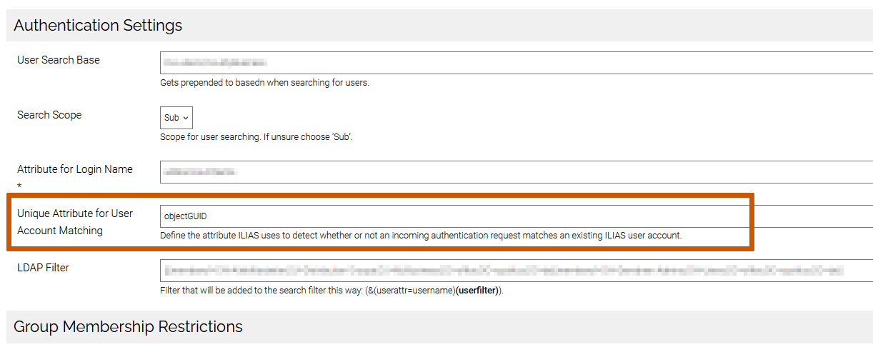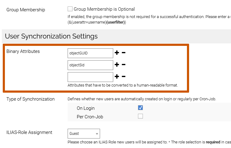 Additionaly, using these values for user binding creates another problem: the way LDAP is implemented in ILIAS, the attribute used to bind user accounts to the AD is the same value that the user has to use to login, which means using ObjectGUID for binding would not be all that practical unless you can keep logging in using something else (currently "Attribute for Login Name").