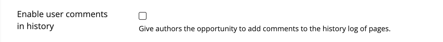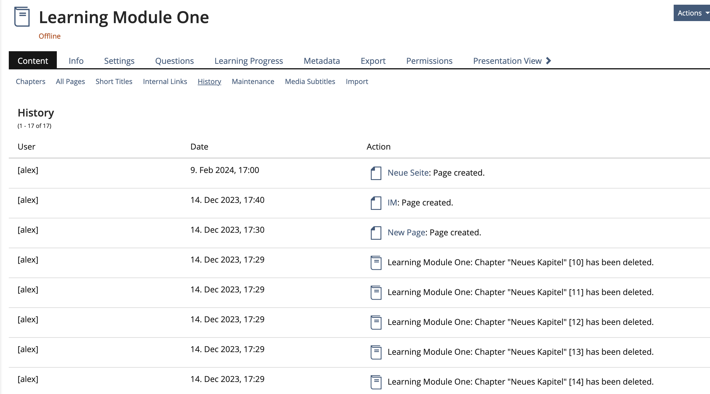 The learning modules provide a history feature for listing additions/deletions on the page chapter level. Comments can be added to these entries in the editor.