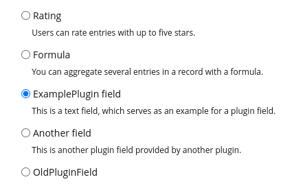 - If one or more PlugIns are available on the ILIAS installation, then a separate entry should be displayed for each PlugIn in the radio group for datetype of a field. The PlugIn provides the title of the datetype so that it can be clearly identified – if available also a description. In this way, each datetype PlugIn is equivalent to other datetypes and can be better recognised. In addition, the user does not have to deal with the information 'PlugIn' for which he has no added value. The user must know what kind of field it is.