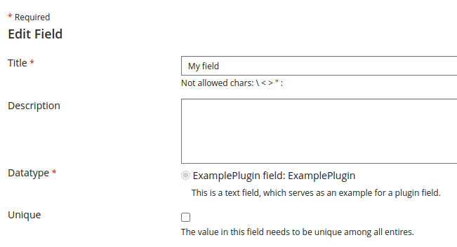 The editation view will change accordingly to the creation view. Due to the last recent changes only the selected plugin field will be visible: