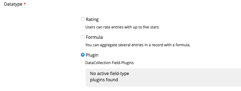 The Datatype 'PlugIn' of a field is offered regardless of whether a PlugIn for a field exists in the data collection. In the most installations, this does not contain anything and therefore no useful action can be executed.