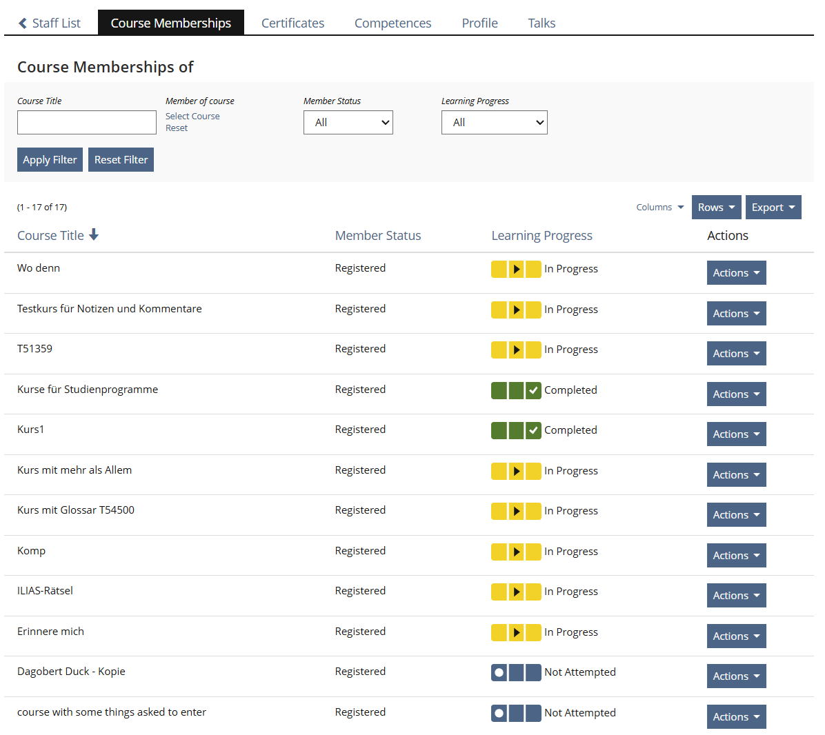 The panel offers a viewcontrol for pagination and sortation (not included in the mockup). The sortation can be done only by course title.