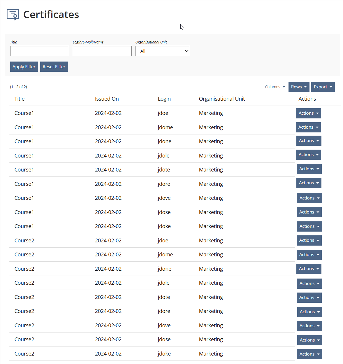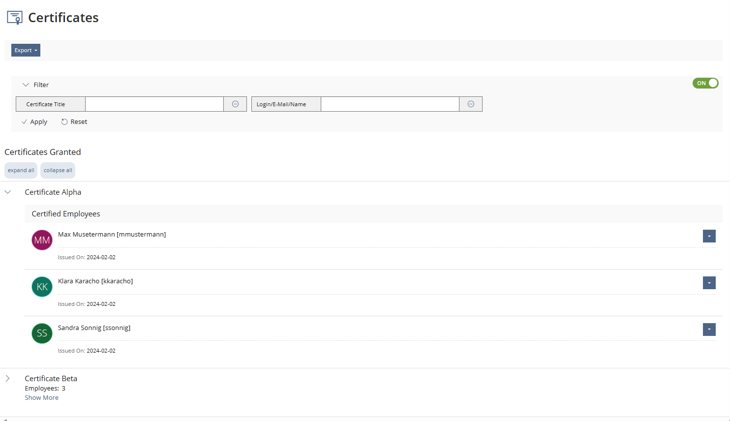 Filtering takes place on two levels. Filtering at the second level causes the entries at the second level to disappear, but not those at the first level. This means that certificates without employees can theoretically be displayed in the table. However, if you filter according to the certificate title (first level), certificates that do not apply, including employees, are removed.
