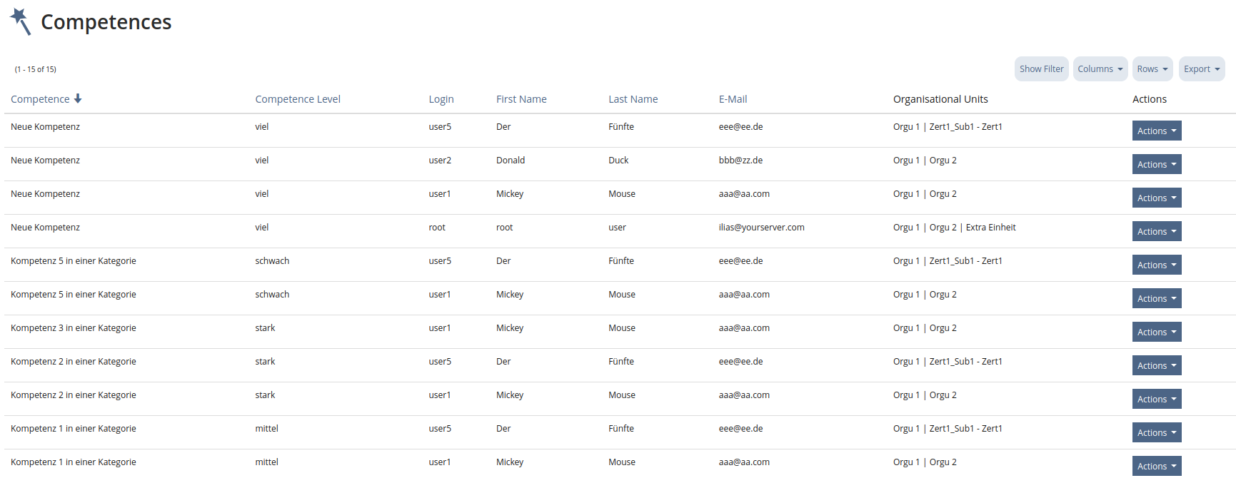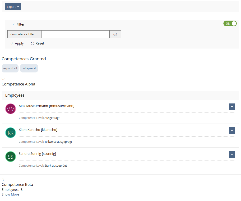 Filtering takes place on two levels. Filtering at the second level causes the entries at the second level to disappear, but not those at the first level. This means that competences without employees can theoretically be displayed in the table. However, if you filter according to the competence title (first level), competences that do not apply, including employees, are removed.