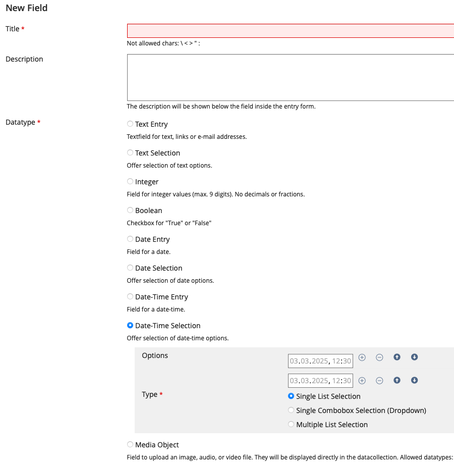 - 'New Field' Form in 'Fields'-Tab of a Table of a Data Colletion