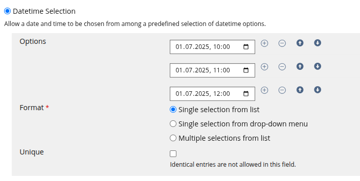 JourFixe, ILIAS [jourfixe], 17 MAR 2025: We highly appreciate this suggestion and accept the feature for ILIAS 11. We accept the fact that there will be date and date-time inputs in the form. Reasons for this are e.g. support of uniqueness and the input forms.