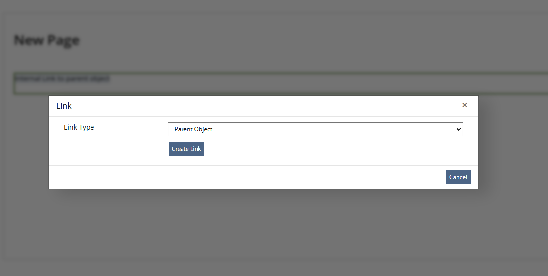 The Modal for Internal Links gets a new option "Parent Object". After choosing this option, there is no further selection possible. Therefore there has to be a button "Create Link" in order to create the link and close the modal.