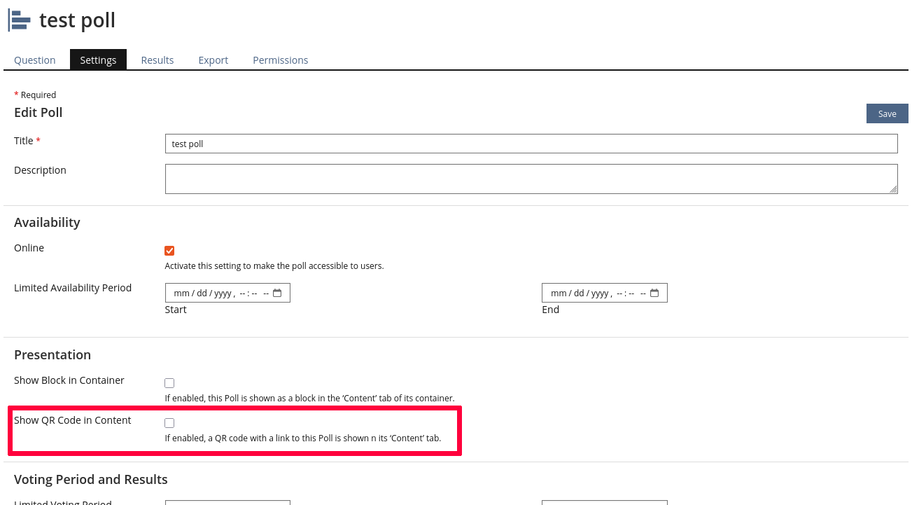 The Content Tab of Polls (see Content Tab for Poll) should contain an optional block with a QR code of the static link to the Poll.