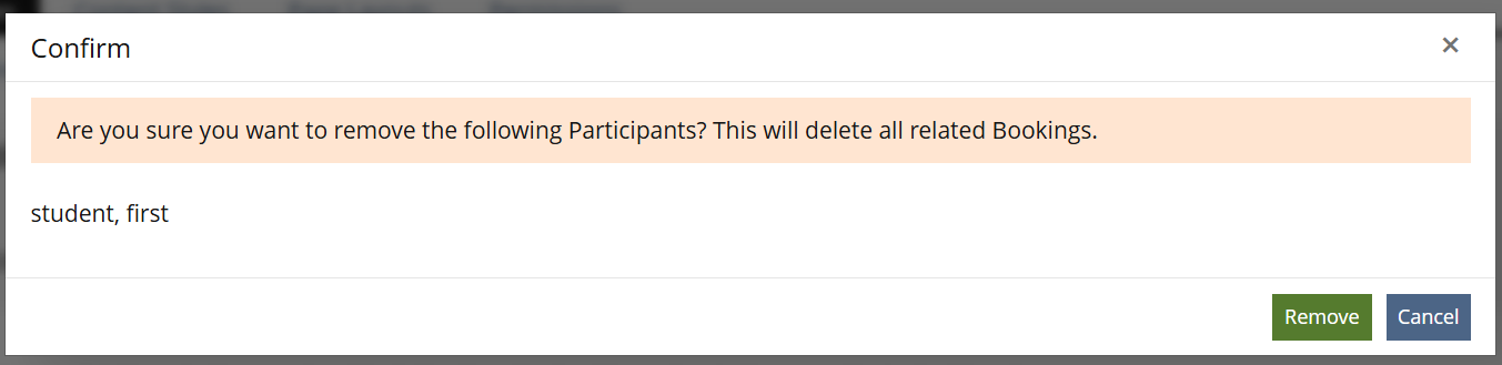 User with Permissions to Edit the Booking Pool are able to remove Participants at the tab "Participants". With removing a account, the bookings of this account have to be deleted, too. A new action will be shown at the tab "Participants": "Remove Participant"